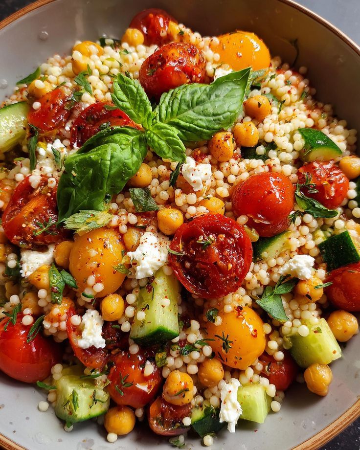 Priprava: Zelenjavo narežemo na večje kose, jo razporedimo po pekaču, dodamo mali grozdasti paradižnik, pokapamo z oljčnim oljem, začinimo in pečemo pri 200 °C približno 25–30 minut, da se lepo zmehča in rahlo zapeče. Medtem pripravimo osnovo: kuskus prelijemo z vročo vodo in pustimo, da nabrekne, ali pa uporabimo kuhano lečo. Jogurt zmešamo z limoninim sokom, drobno sesekljanim česnom, dodamo malo oljčnega olja in sol.
