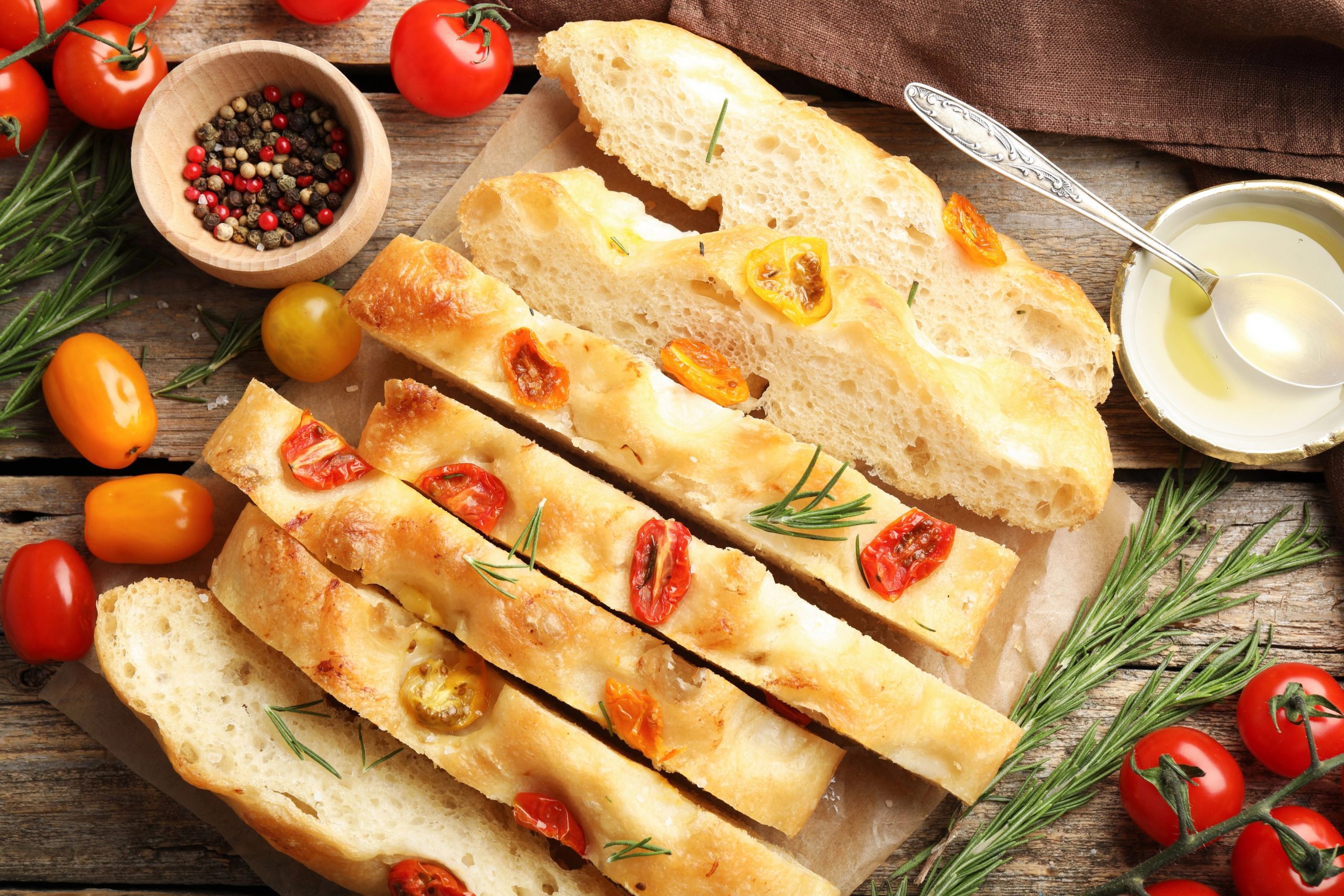 Priprava: Iz moke, kvasa, vode, soli in oljčnega olja zamesimo mehko testo in ga pustimo vzhajati približno eno uro. Nato ga raztegnemo (to delamo v pekaču), s prsti naredimo značilne vdolbinice, nanj razporedimo češnjeve in datljeve paradižnike ter jih rahlo potisnemo v testo. Vse skupaj pokapamo z oljčnim oljem, potresemo z zelišči in pečemo pri 200 °C približno 25 minut, da se fokača zlato zapeče, paradižniki pa postanejo mehki in izrazito aromatični.