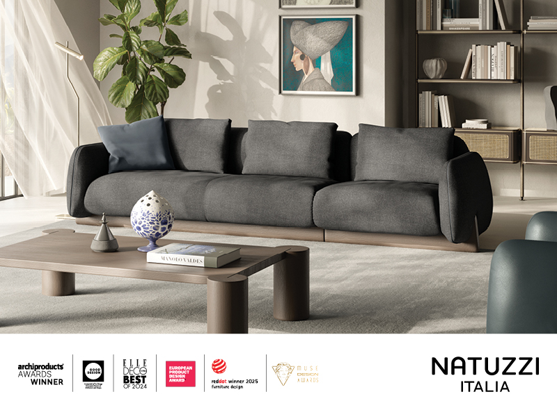Zato pravzaprav ne preseneča, da je prav ta model sedežne garniture osvojil več prestižnih nagrad v letu 2025. Ponaša se z mednarodnimi priznanji Red Dot Design Award 2025 (v kategoriji oblikovanja pohištva), Gold Muse Design Award 2025 ter Good Design Award. Njegova sposobnost združevanja arhitekturne strukture z nežnim, organskim slogom in udobjem ga tako postavlja med zmagovalce in med najbolj prepoznavne kose sodobnega oblikovanja.