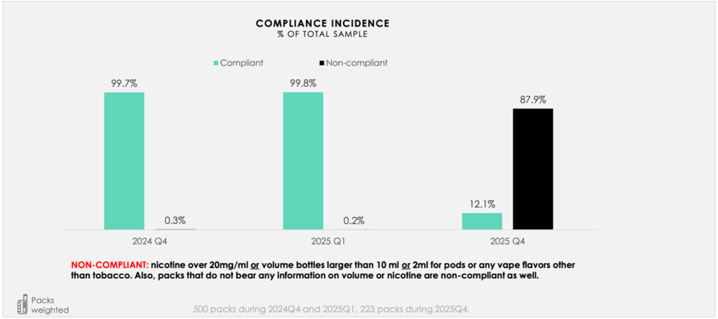 Podatki študije Empty pack, ki velja za mednarodno uveljavljen pristop pri ocenjevanju deleža legalnih in ilegalnih izdelkov, kažejo na izjemno hiter in radikalen preobrat po uvedbi popolne prepovedi arom. Sodeč po rezultatih študije se je v zgolj sedmih mesecih od uvedbe prepovedi legalni trg e-cigaret v Sloveniji skoraj popolnoma preoblikoval v ilegalnega.
